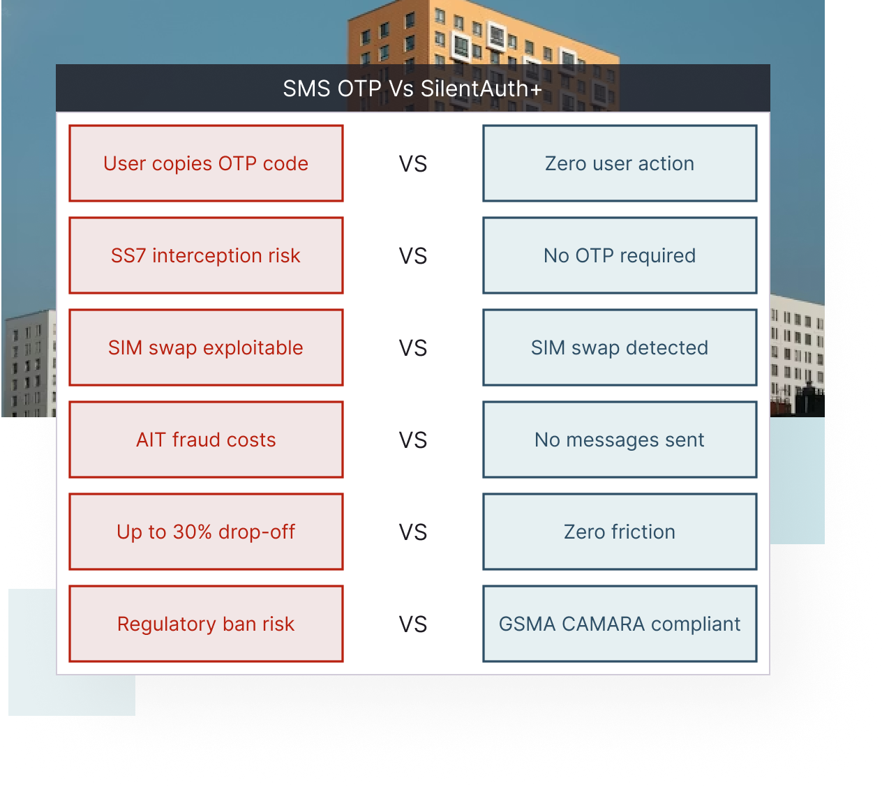 Network-based authentication is faster, more secure, and does not require user input. Unlike SMS OTP, it is resistant to SIM swap fraud, phishing, and delivery failures.